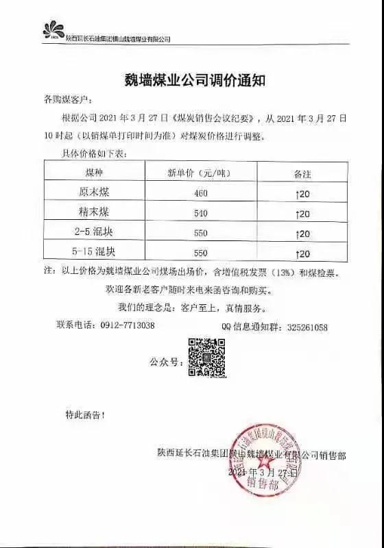 府谷縣老高川鄉(xiāng)恒益煤礦3月27日上午10:00:00時起,面煤、次精煤、二五籽、四九塊各漲價10元/噸。